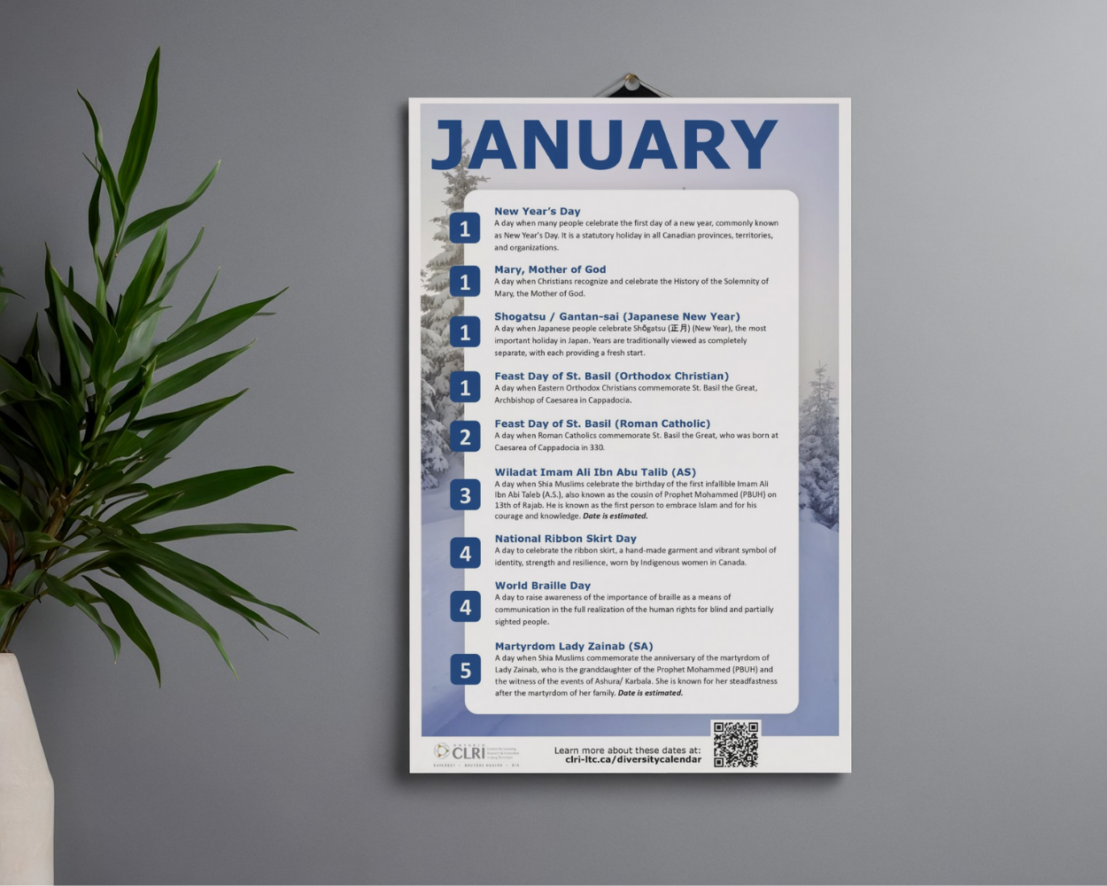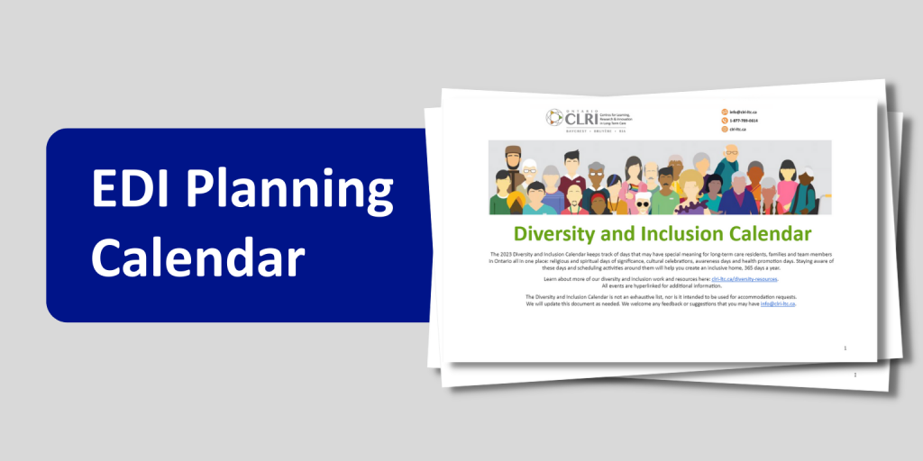 The Diversity and Inclusion Calendar was created by the Ontario CLRI at Bruyère Health and the Ontario CLRI at the RIA and informed by the Equity, Diversity and Inclusion in Long-Term Care Advisory Committee and other experts, including persons with lived experience. We are grateful in particular to the residents who helped design the printable version for all of their guidance and expertise.